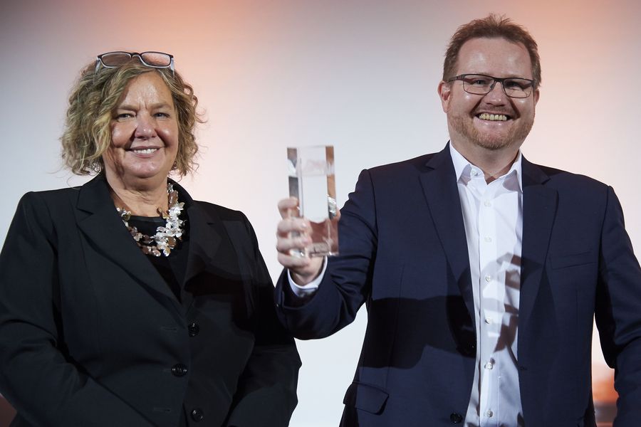 Von links nach rechts im Bild: Frau Dr. Ulrike Wolf und Preisträger Herr Frank Heidenau (Geschäftsführer – BioCer Entwicklungs-GmbH)