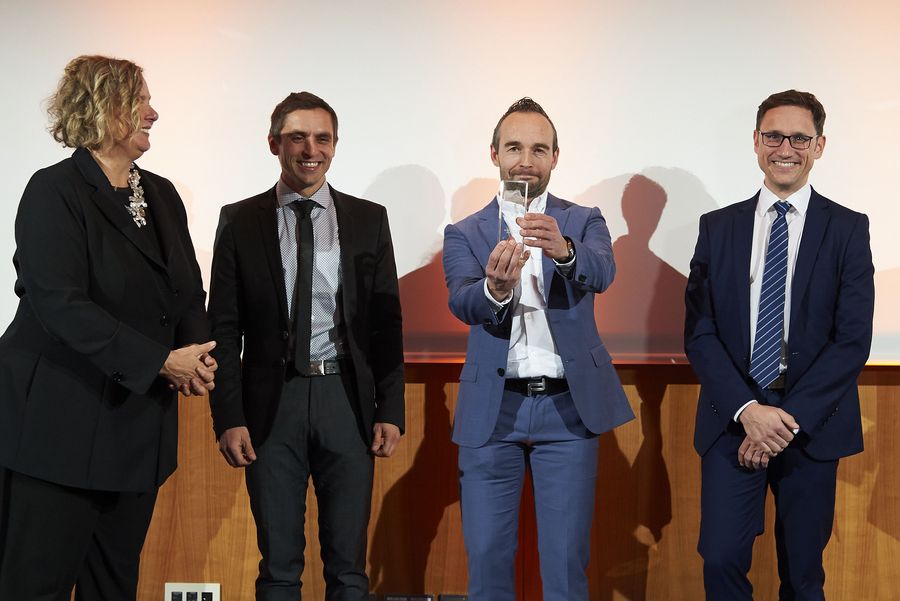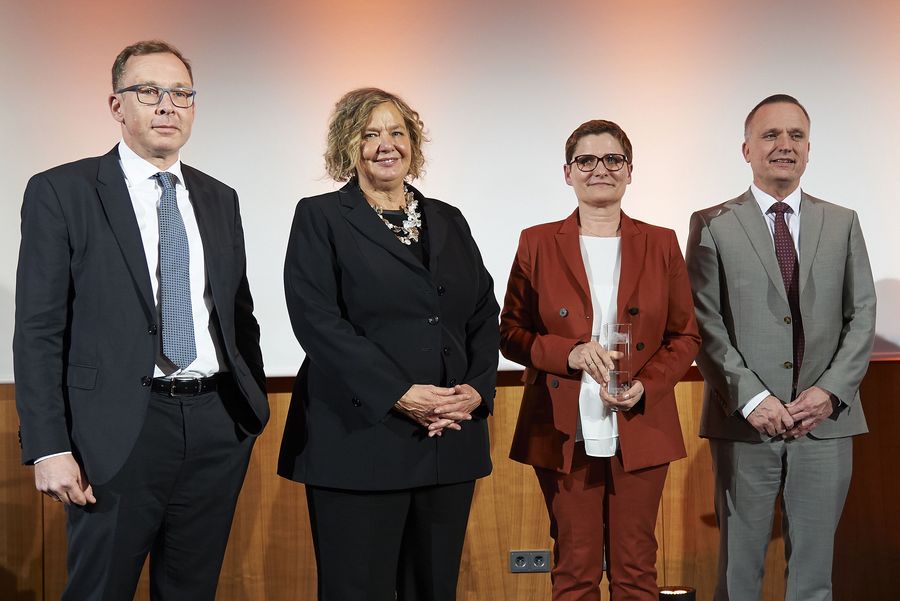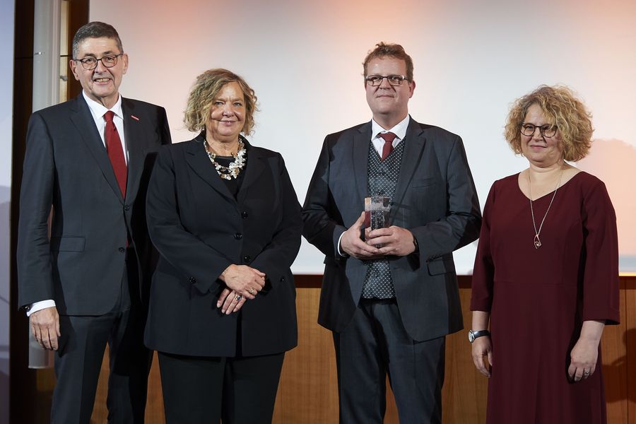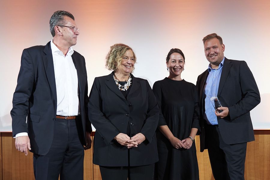 Von links nach rechts im Bild: Laudator Herr Ronald Hager (Rödl & Partner GmbH) und Frau Dr. Ulrike Wolf mit den Preisträgern Gudrun Theuerer und Wilfried Saak (beide Inhaber und Geschäftsführer – MINOVA Information Services GmbH)